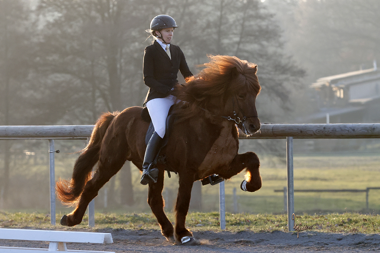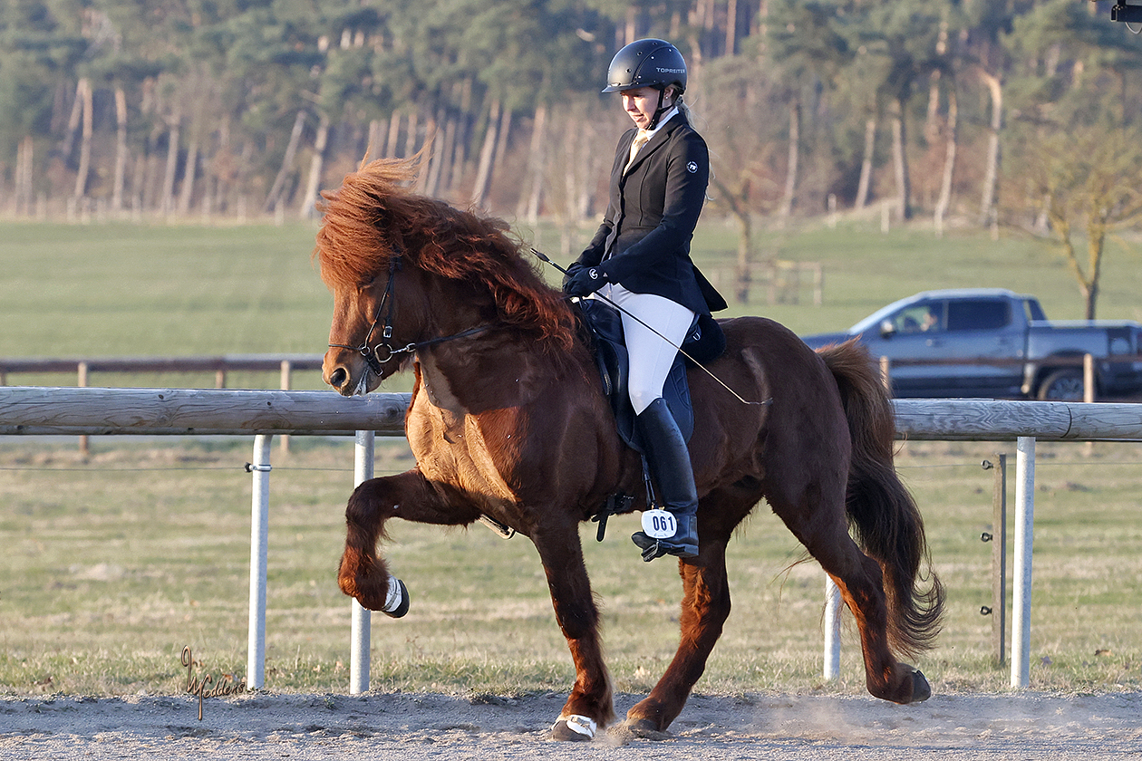 Auch Frauke und 10er-Tölter Sólfaxi konnten bei unserem Qualitag im März einen sehr erfolgreichen ersten gemeinsamen Auftritt hinlegen. Mit mehrmals 8,0 im starken Tempo Tölt entschieden sie die T1 klar für sich.